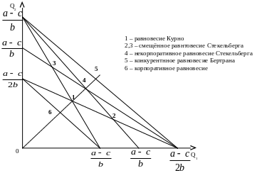 Диаграмма возможных конкурентных стратегий в задаче Курно–Стекельберга представлена на рисунке.