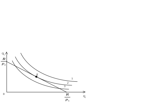 Рассмотрим 3 кривых безразличия. Потребительские наборы, лежащие на 1-ой кривой недоступны. На 3-ей кривой доступны многие ситуации. На 2-ой кривой существует один набор, который можно купить. Обозначим его точкой Е. Заметим, что не существуют других наборов, которые достигают E в полезности и находятся в рамках бюджета. Все наборы на 2-ой кривой лучше, чем на 3-ей. Решением этой задачи будет точка, полученная в результате касания бюджетной линии и максимально удаленной от начала координат кривой безразличия. При заданном бюджете цель потребителя – найти максимально удаленную от начала координат кривую безразличия. Точка касания единственная, следовательно, задача решена и имеет единственное решение.