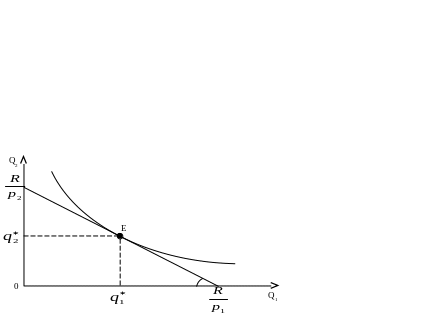 При заданных ценах, потребительском бюджете и потребительском предпочтении существует единственный товарный набор, который доставляет наибольшую полезность при заданных условиях. Либо наоборот – обеспечивает заданную полезность при наименьшем бюджете – основная неоклассическая задача потребления. А точка Е дает нам равновесное решение или, иначе, называется равновесие потребителя.