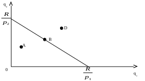 Экономический смысл: рассмотрим различные наборы товаров, которые потребитель желает приобрести: набор А – может пробрести; набор D – может; B – нет. Бюджетное ограничение делит все пространство на 3 части.