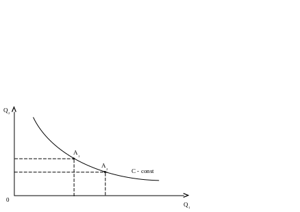 – интервальная норма взаимной замены. Интервальная норма взаимной замены показывает, на сколько единиц нужно уменьшить потребление второго товара при увеличении первого товара на единицу при условии, что общая полезность неизменна. При последовательном увеличении количества одного и того же товара в наборе нам будет требоваться все меньшее количество второго товара для поддержания уровня полезности. Из этого следует два вывода: