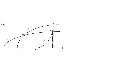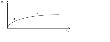 При R1 закупки примерно в одинаковой пропорции. До R2 – некоторое предпочтение q1. Начиная с R2 потребитель практически перестает потреблять q2, т.е. происходит насыщение товаром q2.