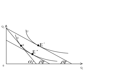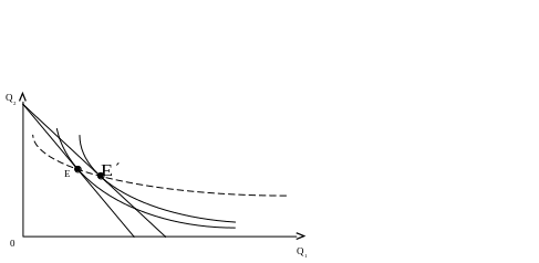 , а потребитель решит остаться на кривой безразличия, т.е. он сохранит реальный доход, то он перейдет из E в E||, в этой реальный доход неизменен, а номинальный доход снижается. Переход из E в E|| называется «эффект переключения D».