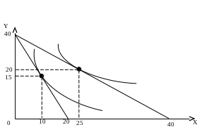 2.16. Допустим, потребитель имеет месячный доход М=200. на рис. показаны две бюджетные линии и соответствующие им кривые безразличия.