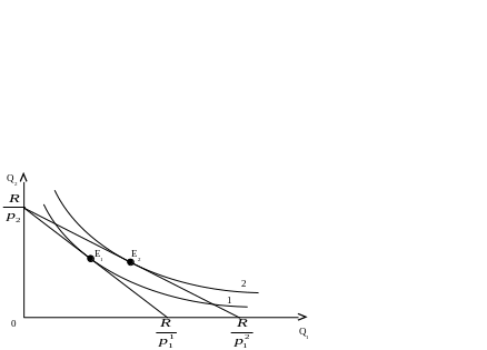 предметы роскоши. Их потребление начинается на достаточно высоком уровне R и уже неограниченно. В точке B предмет роскоши начинает превалировать над (2).