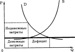 В случаях, когда цена находится ниже равновесного уровня, дефицит не ослабевает, а усиливается, к тому же к денежным затратам потребителя добавляются неденежные (см. рис. 3.15).