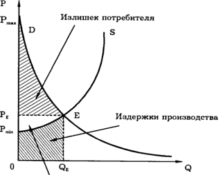 Поскольку цена равновесия обычно ниже максимально предлагаемой потребителями цены, величину излишка (выигрыша) потребителя графически можно изобразить через площадь Pmax EPE (см. рис. 3.13). В свою очередь, равновесная цена обычно выше минимальной цены, которую могли бы предложить наиболее передовые фирмы.
