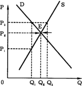 Устойчивость равновесия. Устойчивое равновесие достигается тогда, когда отклонения цен спроса от цен предложения постепенно погашаются, стремясь к равновесной цене PE , a объем предложения приспосабливается к объему спроса. В точке равновесия цена спроса совпадает с ценой предложения (РD = PS) и объем спроса равен объему предложения (QD = QS).