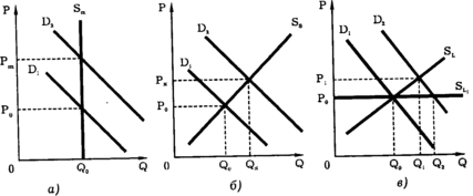 Рис. 3.9. Изменение цен и объема предложения в кратчайший (а), короткий (б) и длительный (в) периоды