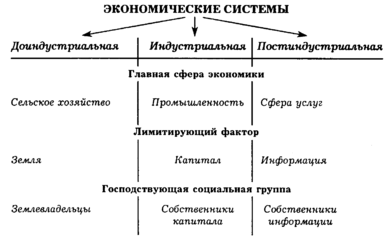Историческая классификация экономических систем должна включать, помимо современных, системы прошлого и будущего. В этой связи заслуживает внимания классификация, предложенная представителями теории постиндустриального общества, которые выделяют доиндустриальные, индустриальные и постиндустриальные экономические системы (см. рис. 2.6).