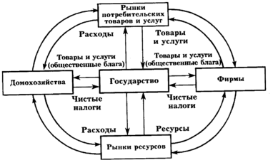 Домашние хозяйства и фирмы платят в пользу государства налоги, получая от него, в свою очередь, трансфертные платежи и субсидии. Кроме этого, правительство осуществляет на всех рынках крупные закупки как потребительского, так и производственного характера.