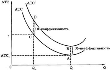 Даже при совершенной конкуренции возможна Х-неэффективность (рис. 8.7). В этих условиях фирма увеличивает производство до той точки, где пересекутся предельные и средние издержки, в нашем случае — до минимума АТС (на рис. 8.7 она обозначена как точка А). Если реальные издержки превышают минимальные АТС на величину АВ, то при производстве Qс возникает Х-неэффективность.