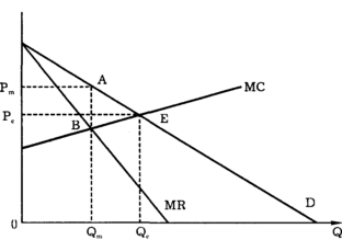 Поскольку монопольная цена превышает предельные издержки (Рm > МС), то величина излишка потребителей и излишка производителей меняются. Площадь треугольника ABE соответствует величине чистых убытков от монопольной власти, или так называемой величине мертвого груза монополии.