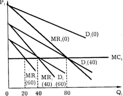 Если теперь фирма Б будет производить 40 единиц, то фирма А отреагирует на это сдвигом кривой спроса до положения D1 (40), а ее производство сократится до 40 (именно в этом случае MR1 (40) = МС1).