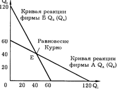 Аналогичный анализ можно осуществить и в отношении фирмы Б, получив в результате еще одну кривую реакции — QБ(QА). Пересечение кривых реагирования этих двух фирм (точка Е) показывает равновесие Курно: каждая фирма правильно угадывает поведение конкурента и принимает оптимальное для себя решение, ни одна из фирм не имеет стимула изменять свой объем производства.