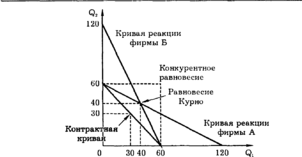 Равновесие Курно достигается, когда Q1= Q2 = 40, а суммарный выпуск составляет 80 единиц. Если фирмы договорятся максимизировать совокупную прибыль, чтобы затем разделить ее пополам, то множество возможных решений этой задачи будет ложиться на контрактную кривую. При этом суммарный выпуск Q1 + Q2 = 60.