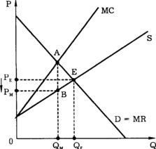 Тогда фирма-монопсонист, используя свою власть, сократит объем закупок с равновесного уровня QЕ до QМ что вызовет понижение цены с PЕ до РМ. Таким образом, затраты монопсониста на покупку продукции (как правило, это производственные ресурсы) будут ниже, чем в условиях совершенной конкуренции.