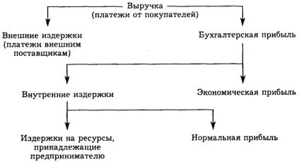 Однако сами издержки бывают внешними (явными) и внутренними (неявными). К внешним издержкам относятся платежи внешним (по отношению к данной фирме) поставщикам. Вычтя из совокупной выручки (дохода) внешние издержки, мы получаем бухгалтерскую прибыль.
