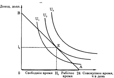 Поэтому более типичной является ситуация, изображенная на рис. 10.3, где равновесие достигается в точке Е. При этом свободное время составляет Н0, рабочее время — (24 – Н0), дневной доход, I0 = w(24 – Н0). Наклон бюджетного ограничения равен -w — ставке заработной платы.