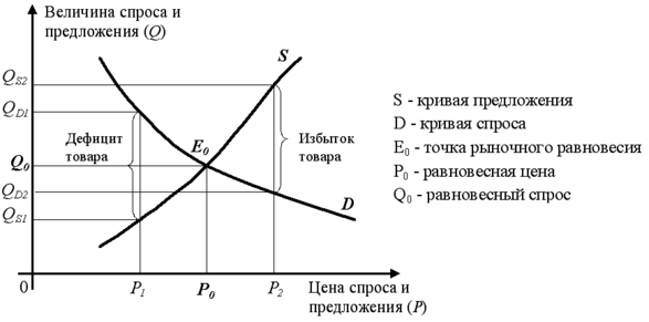 Изобразим путем совмещения на одном графике кривые спроса D и предложения S на определенный товар; при этом будем иметь в виду рыночный спрос и рыночное предложение, то есть спрос и предложение всех участников рынка на данный товар.