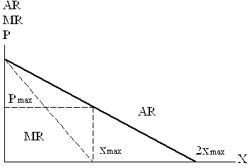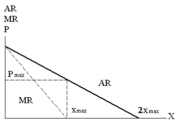 Точка максимальной выручки, как и в случае совершенной конкуренции, определяется положением, при котором предельная выручка (МR) равна нулю, т.е. суммарная выручка (TR) перестает расти. На графике это точка xmax, т.е. место, где кривая МR пересекает нулевую горизонтальную ось. Ниже этой оси МR приобретает отрицательные значения, т.е. TR начинает убывать.