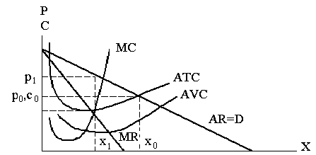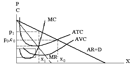 Разумеется, прибыль образуется только тогда, когда цена превышает средние полные издержки (р>АТС), что соответствует точке пересечения кривых полных издержек и спроса. При совершенной конкуренции именно в этой точке образуется рыночное равновесие, т.е. равновесной цене р0 соответствует равновесное предложение x0. При совершенной конкуренции фирма, как правило, не может получить цену большую, чем равновесная. Монополия же имеет такую возможность, причем образуется целая зона (от x0 до х1), где реализуется монопольная сверхприбыль.