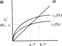 Норма накопления (сбережения) непосредственно влияет на устойчивый уровень фондовооруженности. Рост нормы сбережения с s1 до s2 сдвигает кривую инвестиций вверх из положения s1ƒ(k) до s2(k) (см. рис. 3).