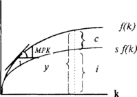 Необходимым условием равновесия экономической системы является равенство совокупного спроса и предложения. Предложение описывается производственной функцией с постоянной отдачей от масштаба: Y=F(K,L) и для любого положительного z верно: zF(K,L)= F(zK, zL). Тогда если z=1/L, тоY/L=F(K/L,1). Обозначим (Y/L) через у, а (K/L) через к и перепишем исходную функцию в форме взаимосвязи между производительностью и фондовооруженностью (капиталовооруженностью): у=ƒ(k) (см. рис. 1). Тангенс утла наклона данной производственной функции соответствует предельному продукту капитала (МРК), который убывает по мере роста фондовооруженности (k).