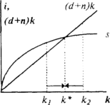 Отметим, что с увеличением темпа роста населения возрастает угловой коэффициент кривой (d+n)k , что приводит к уменьшению равновесного уровня фондовооруженности (k′*), следовательно, к падению у.