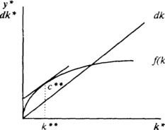 Оптимальная норма накопления, соответствующая "золотому правилу" Э. Фелпса, обеспечивает равновесный экономический рост с максимальным уровнем потребления. Устойчивый уровень фондовооруженности, соответствующий этой норме накопления, обозначим k**, а потребления - с**.