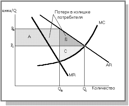 При монополии цена выше и потребители покупают меньше продукции. Из-за более высокой цены те потребители, которые покупают товар, теряют часть излишка, показанную прямоугольником А. Те потребители, которые не могут купить товар по цене Рm, но купили бы его по цене РC, также теряют излишек в размере площади треугольника В. Следовательно, совокупная потеря потребительского излишка составляет А + В. Производитель, однако, получает прибыль, обозначенную прямоугольником А, продавая товар по более высокой цене, но теряет часть излишка, обозначенную треугольником С, представляющую собой дополнительную прибыль, которую производители получают от продажи (QC - Qm) по цене РC. Общая прибыль производителя, следовательно, составит А - С. Вычитая потерю потребительского излишка из прибыли производителя, мы получим чистые убытки, равные В + С. Это полные чистые убытки от монопольной власти. Даже если прибыли монополиста были обложены налогом и перераспределены в пользу потребителей продукта, эффективность не будет достигнута, потому что объем производства будет ниже, чем в условиях свободной конкуренции. Общие чистые убытки - это общественные издержки такой неэффективности.