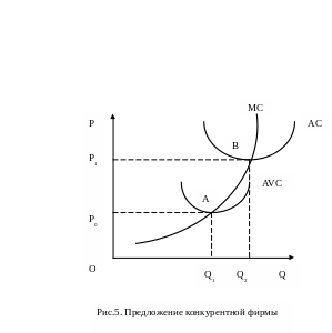 Итак, кривая предложения конкурентной фирмы представляет собой ветвь кривой предельных издержек, которая лежит выше минимума средних переменных издержек. Кривая предложения конкурентной фирмы изображена на рис.5. При выпуске Q1 достигается минимум средних переменных издержек, равный p1, а при выпуске Q2 – минимум средних издержек, равный p2.