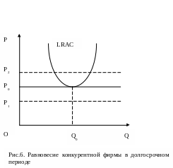 Покажем, что с течением времени на рынке совершенной конкуренции цена продукта тяготеет к минимальным долгосрочным средним издержкам (цена p0 на рис.6).
