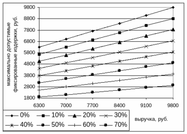 Пусть выручка будет меняться в диапазоне от 6300 руб. до 9800 руб., маржинальные издержки – от 0 % до 70%. Интерес представляет значения максимально допустимых фиксированных издержек. Они рассчитываются по формуле: