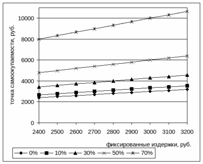 Пусть фиксированные издержки FC могут меняться от 2400 руб. до 3200 руб., а переменные издержки VC – от 0 до 70%. Проведём анализ точки безубыточности (по формуле 1.6). Результаты анализа сведены в таблице 4 и диаграмме 3.