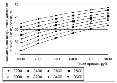 Зависимость максимально допустимых удельных переменных издержек от объёма продаж.