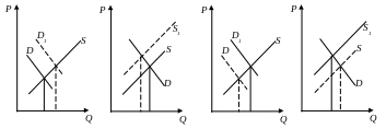 Рис. 3. Установление точки равновесия спроса и предложения: Р - цена; Q – величина спроса или предложения; D, D1 – спрос до и после изменения; S, S1 – предложение до и после изменения; а) увеличение спроса ведет к росту цены и расширению предложения; б) уменьшение предложения ведет к повышению цены и сокращению спроса; в) уменьшение спроса ведет к падению цены и сокращению предложения; г) увеличение предложения ведет к падению цены и расширению спроса.