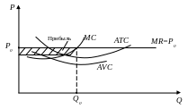 Производя продукцию в количестве Q0 , при котором обеспечивается равенство цены и предельных издержек, фирма получает прибыль, поскольку сложившаяся на рынке цена P0 превышает минимальные средние валовые издержки.