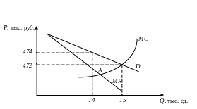 Предположим, что одну единицу своей продукции монополист может продать по цене 500 тыс. руб. В дальнейшем при расширении сбыта на 1 тяс. ед. он вынужден каждый раз снижать ее цену на 2 тыс. руб., поэтому предельный доход сокращается на 4 тыс. руб. при каждом расширении объема продаж. Фирма будет максимизировать прибыль, производя 14 тыс. ед. продукции. Именно при таком объеме выпуска ее предельный доход в наибольшей степени приближен к предельным издержкам. Если она произведет 15 тыс. ед., то эта дополнительная 1 тыс. ед. больше добавит к издержкам, чем к доходу, и тем самым уменьшит прибыль. Не произведенная монополистом 15-я тысяча (а она была бы выпущена в условиях конкуренции) означает потерю для потребителей, так как часть из них отказались от покупки из-за высокой цены, установленной производителем-монополистом.