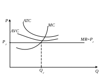 В краткосрочном периоде фирма продолжит производство даже в том случае, когда она не сможет получать прибыль, при условии, что цена окажется выше минимальных средних переменных издержек. В такой ситуации задачей фирмы станет минимизация убытков, возникших из-за снижения рыночной цены. Если цена упадет ниже минимальных средних переменных издержек, фирма предпочтет остановить производство и закрыться.