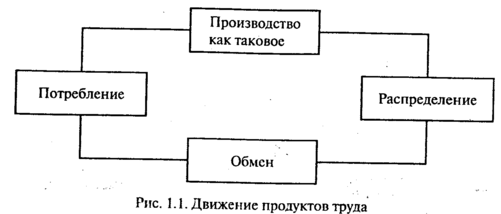 Экономические блага совершают движение по такому кругу: производство — распределение — обмен — потребление. Эта последовательность на­глядно представлена на рис. 1.1.