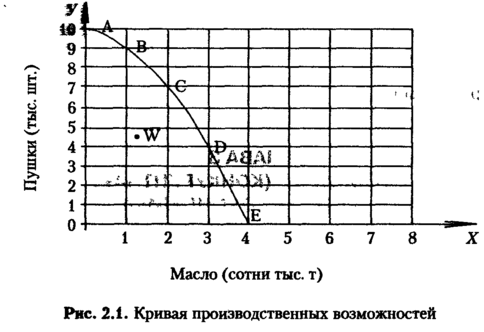 Из данного рисунка видно, что каждая точка на кривой производственных возможностей представляет какой-то максимальный объем производства двух продуктов. Ограниченность ресурсов не допускает какого-либо сочетания производства в точке W, расположенной вне кривой производственных возможностей. Именно в этом суть проблемы экономии.