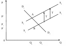 Действительно, если ранее покупатели согласны были приобрести количества товара Q1 при цене Р1, то теперь они согласятся приобрести то же количество товара, если только его цена без налога будет на Т руб. ниже. Тогда покупатели заплатят цену с включением налога, равную прежней цене.