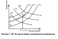 4. Объем реального национального продукта (стоимость продукта в неизменных ценах) и темп инфляции, обеспечивающие равенство между совокупным спросом и предложением, обычно называют состоянием общего макроэкономического равновесия (сбалансированности) экономики. Это важнейшая составляющая народнохозяйственной сбалансированности. На рис. 5 заданы кривые совокупного спроса AD и предложения AS и точка Е, фиксирующая состояние общего экономического равновесия («крест Кейнса»).