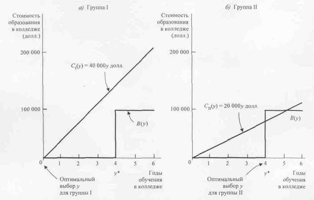 Решая, какое образование получить, люди сравнивают выгоду от него (повышенную оплату труда) с издержками. Представители каждой группы принимают решение по следующей схеме: следует получить образование за у" лет, если выгода от него (т. е. прирост заработка), по крайней мере, не ниже затрат на образование. Для обеих групп выгода (увеличение заработков) составляет 100 000 долл. Издержки, однако, у них разные. В группе I они равны 40000у долл., тогда как в группе II — всего лишь 20000у долл. Поэтому представители группы I не будут получать образование, если