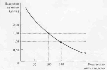 Эта проблема стоит не только перед страховыми компаниями. Моральный риск отражается и на способности рынков эффективно распределять ресурсы. Пусть, например, кривая D на рис.3 показывает спрос на автомобильные перевозки, выраженный в милях в неделю. Кривая спроса убывает, поскольку многие потребители переключаются на альтернативные средства передвижения с ростом цен перевозок автомобилями. Предположим сначала, что издержки перевозок включают стоимость страховки и что страховые компании могут точно измерить, сколько миль проехал водитель. В таком случае моральный риск отсутствует. Водители знают, что страховой взнос на длинные перевозки будет увеличен и, следовательно, вырастут общие издержки перевозок (издержки на милю пути считаются постоянными). К примеру, если издержки перевозок равны 1,50 долл. на милю (из которых 50 центов приходится на страховку), то водитель решает наездить 100 миль в неделю.