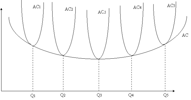 Каждая фирма в тот или иной момент характеризуется определенными масштабами производства, которым соответствует та или иная кривая средних издержек короткого периода. Таких кривых существует столько, сколько масштабов производства исследуется. Меняя эти масштабы, фирма переходит от одной кривой средних издержек короткого периода к другой. При этом средние издержки до определенного объема выпуска будут уменьшаться, а затем начнут постепенно возрастать (на рисунке это видно при переходе от АС1 к АС3, а затем от АС3 к АС5).