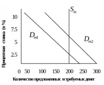 Уменьшение спроса на деньги запускает рассмотренные процессы в противоположную сторону. Предположим, что кривая спроса на деньги сдвинулась влево-вниз из первоначального положения равновесия. В этом случае доля денег в портфеле активов хозяйственных агентов была бы больше, чем это совпадало бы с их желаниями. Хозяйственные агенты моментально начнут структурные изменения в своих портфелях активов, либо используют деньги для погашения ранее взятых ссуд. Такие действия, предпринятые одновременно и во множестве, взвинтят цены на ценные бумаги и понизят норму ссудного процента, однако не смогут изменить количество денег, находящихся в обращении, которое предлагает им банковская система. Равновесие на рынке денег было бы достигнуто только тогда, когда процентные ставки упали бы до уровня, обеспечивающего соответствие количества денег, находящихся в обращении, количеству денег, размещённых в портфелях активов хозяйственных агентов.