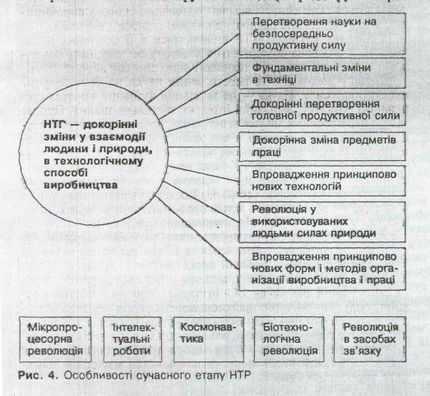 Особливості сучасного етапу НТР і економічний прогрес. З середини 70-х років почався новий етап розвитку НТР, пов'язаний передусім з електронною автоматизацією матеріального виробництва й обігу, науково-технічної творчості. Його вихідним пунктом є поява і розвиток мікропроцесорів на великих інтегральних схемах — мікропроцесорна революція (рис. 4). Так, кристал площею 1 см2 може за допомогою магнітних хвиль накопичувати 5 млн. біт інформації. Така мініатюризація основних блоків комп'ютерних систем, у тому числі пристроїв пам'яті (або блоків пам'яті), дає змогу підключати їх до будь-якої машини і механізму як керуючу частину. Завдяки цьому з'явилися досконалі комп'ютери, електронні блоки управління в побутовій техніці тощо. В сучасних суперкомп'ютерах міститься 16 і 61 тис. паралельно діючих мікропроцесорів, що дає змогу здійснювати до 7 млрд. операцій за секунду. У США ведуться розробки суперкомп'ютера, що містить майже 1 млн. мікропроцесорів, який здійснюватиме 10000 операцій за секунду. До 70% таких машин створюється у США, 28% — в Японії, 1% — у Німеччині.