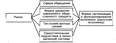 Отсюда рынок как экономическая категория есть совокупность конкретных экономических отношений и связей между покупателями и продавцами, а также торговыми посредниками по поводу движения товаров и денег, отражающая экономические интересы субъектов рыночных отношений и обеспечивающая обмен продуктами труда.